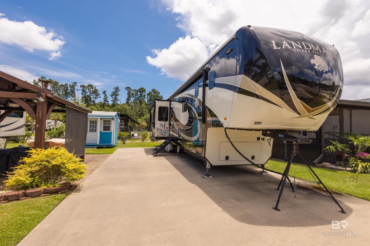 Lot 27 in Creekside RV Resort is located just off County Road 20 in Foley, Alabama - conveniently situated between Hwy 59 and the Foley Beach Express. This central location places you minutes from OWA, Tropic Falls Water Park, Foley Sports Complex, Tanger Outlets, and the white-sand beaches of Gulf Shores and Orange Beach.Measures approximately 80' by 40', with a concrete slab RV pad - 20' x 60', offering generous space for large Class A, B, or C motorhomes or fifth wheels. Attached to pad - stamped concrete patio with gazebo on it. Beneath the gazebo is a complete outdoor living setup featuring a mounted TV, ceiling fan, table with chairs, a love seat, two armchairs, and a coffee and side tables - ideal for relaxing or hosting guests in comfort and shade. A freestanding storage building on-site offers additional convenience for storing outdoor gear or supplies. Currently operated as a vacation rental, the lot is featured on rvfoley. com with nightly rates for just a lot - $65. The seller is offering the on-site fifth wheel - a 2018 Landmark - for an additional $55,000. The current rate for this improved lot with RV in place runs between $175-250 a night - its a turnkey opportunity for both personal enjoyment and rental income. Creekside RV Resort features a welcoming atmosphere with monthly HOA dues of $180, which cover lawn maintenance, sprinkler service, trash pickup, Wi-Fi, and cable TV. Resort amenities include a heated pool, stocked fishing pond, clubhouse, bathhouses, laundry facilities, a dog park, and a fenced playground. Buyer to verify all information during due diligence.